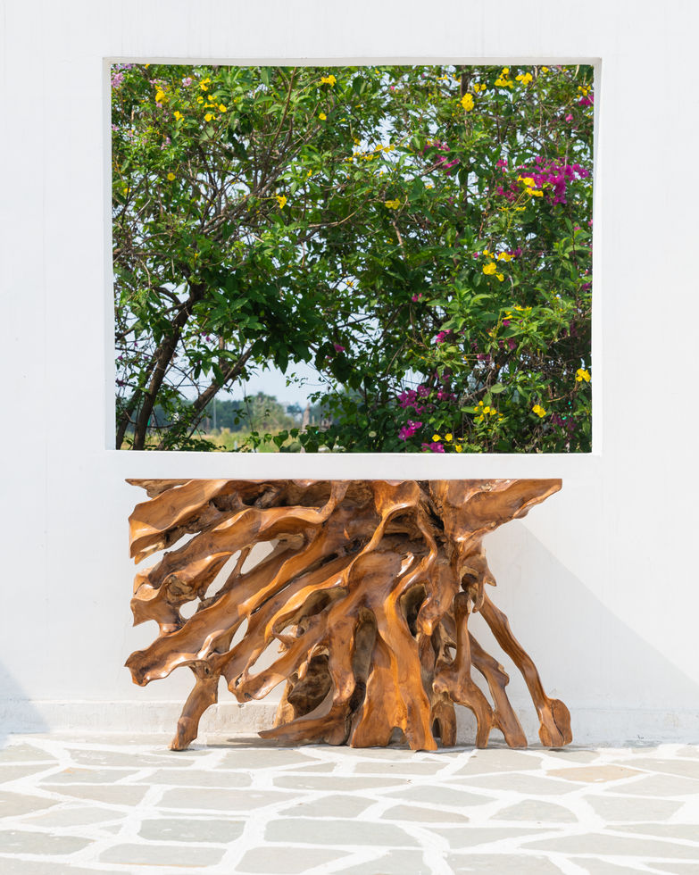 This Natural Teak Console is an artistic embodiment of strength and organic beauty. Crafted from reclaimed teak roots, it blends rustic charm with refined craftsmanship, perfect for modern living spaces.