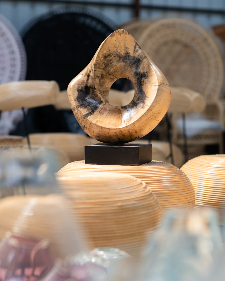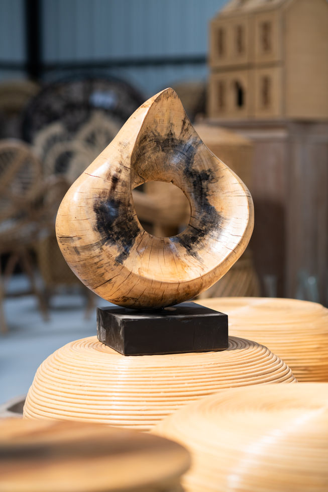 The Tamarind Wood Teardrop Sculpture is a stunning piece of natural art, featuring a unique teardrop shape that beautifully blends organic textures with modern design. The natural grain patterns of the tamarind wood lend an authentic and timeless appeal, making it a perfect centerpiece for living rooms, offices, or art galleries. The sculpture's hollow center adds depth and visual intrigue, contributing to a sophisticated and serene ambiance.